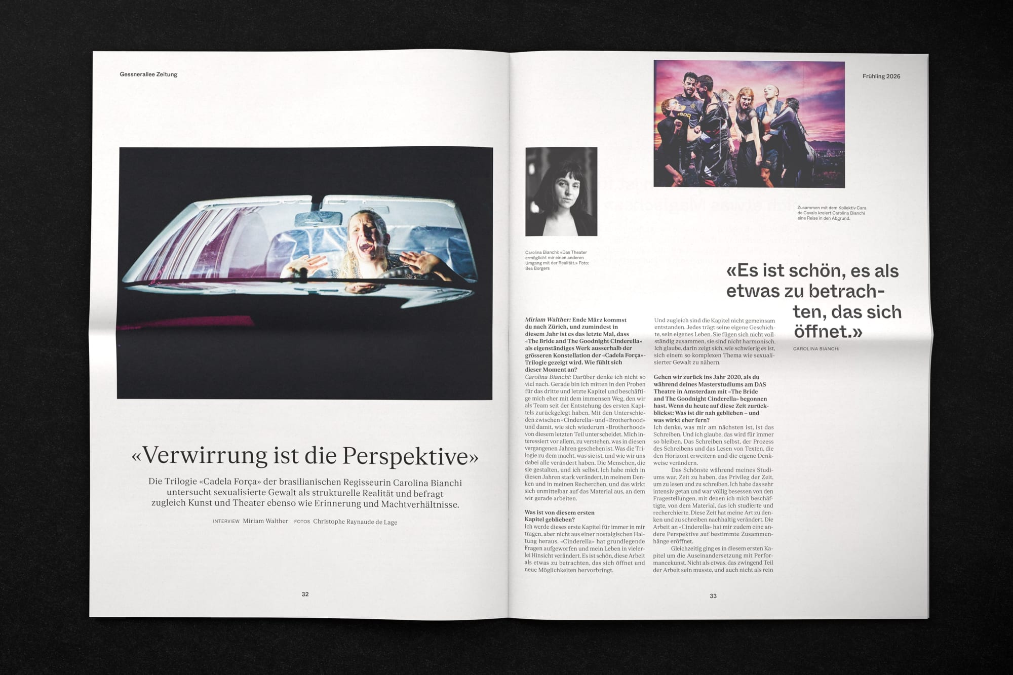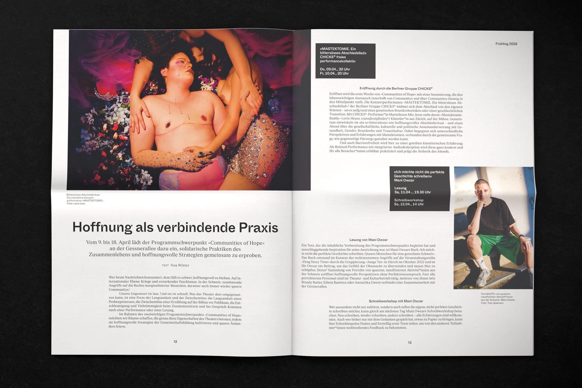 Theater kann verdeckte Schichten freilegen. In dieser Ausgabe begegnen wir Künstler*innen und Denker*innen, die davon erzählen, wie sich Erfahrungen in Körper, Haltungen und Blicken einschreiben und wie Kunst diese sichtbar machen und unterbrechen kann. Ihre Geschichten handeln vom Aufwachsen, von Einsamkeit und Rassismus, von Verletzlichkeit, Freundschaft, Hoffnung und dem Wunsch nach einer anderen Zukunft. Im Theater entstehen Räume für Zwischentöne und ein gemeinsames In-Beziehung-Treten. So eröffnet sich die Möglichkeit, Gegenwart neu zu betrachten und Gemeinschaft immer wieder neu zu denken. (Auszug aus dem Editorial)