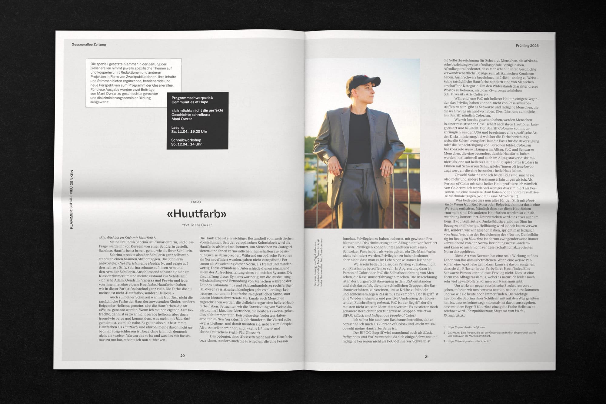 Schön, dass Sie gerade das erste Editorial der neuen Zeitung der Gessnerallee lesen. Wie Sie vielleicht festgestellt haben, gibt es immer mehr Kulturinstitutionen, die zum Mittel einer eigenen Publikation greifen. Uns geht es darum dringliche gesellschaftliche Debatten, aufregende Persönlichkeiten, interessante Gedanken und manchmal pure Unterhaltung in die Öffentlichkeit zu bringen. Wir wollen Themen mit der notwendigen Sorgfalt setzen und die Debatte bereichernd fördern. Wir arbeiten mit unterschiedlichen Formen wie zum Beispiel Analysen, Essays, Interviews, Porträts, Kolumnen, Horoskopen, Playlists. (Auszug aus dem Editorial)